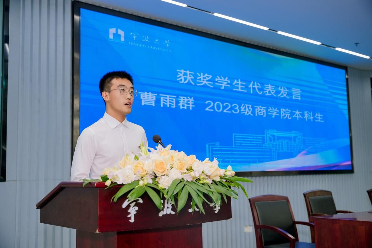 获奖学生代表、h图书馆 2023级信息管理与信息系统专业本科生曹雨群发言。他讲述了自己家庭和求学的故事,表示陆董的善举减轻了他的经济负担,激励他追求学业和个人成长。他表示,未来将继续努力,力争在学习和实践中取得更大成绩,并以实际行动回馈捐赠者,回馈社会。