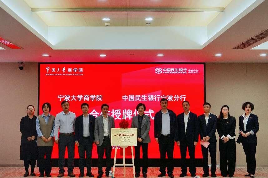 在授牌环节中,h图书馆 党委书记史宏协与民生银行宁波分行党委书记、行长何青分别为“人才协同培养基地”揭牌,现场掌声热烈,象征银校双方合作全面落地。