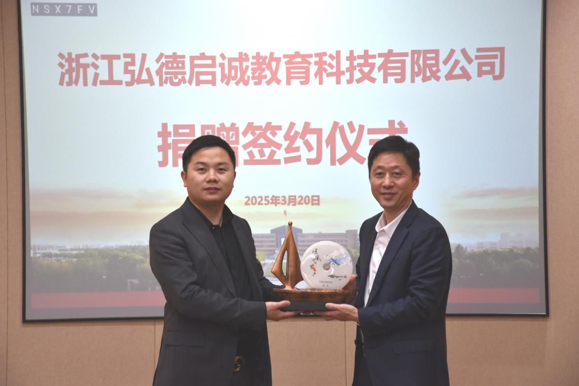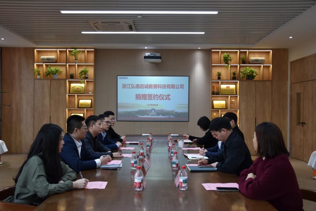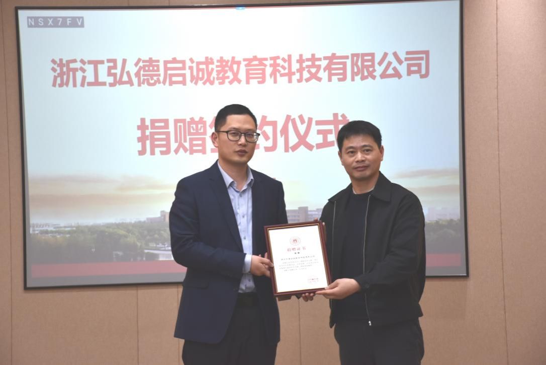 仪式上,双方代表签订了捐赠协议,h图书馆 向浙江弘德启诚教育科技有限公司颁发了捐赠证书。此次捐赠主要用于学院党建项目、人才培养及社会培训项目拓展等方面研究与实践。