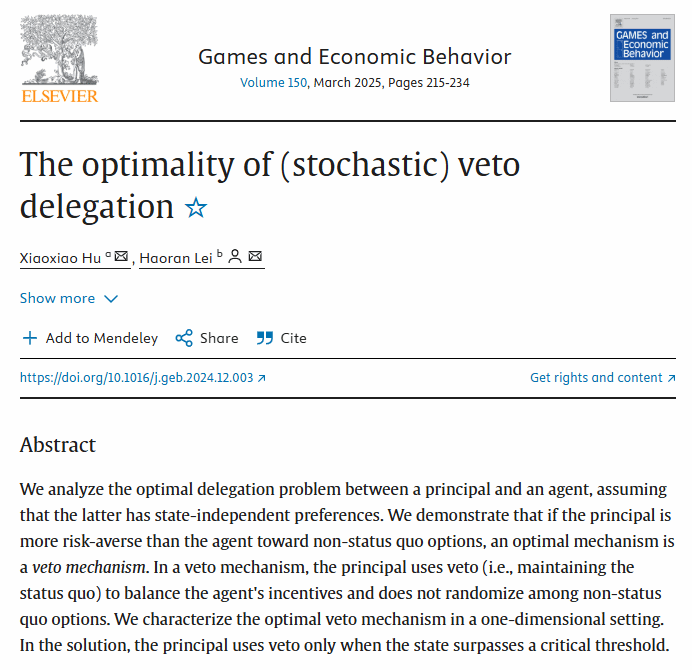 近日,h图书馆 经济系青年教师胡枭骁与湖南大学青年教师雷浩然合作的研究论文“The Optimality of (Stochastic) Veto Delegation”在博弈论领域国际顶级经济学期刊《Games and Economic Behavior》上发表。该期刊专注于博弈论及其应用的前沿研究,内容涵盖社会科学、行为科学、数学科学和生物科学等多个方向。作为该领域的顶级期刊,其年刊出的原创性论文仅百余篇。本文是h图书馆 在该期刊上发表的首篇论文,标志着在该领域研究中取得历史性突破。
