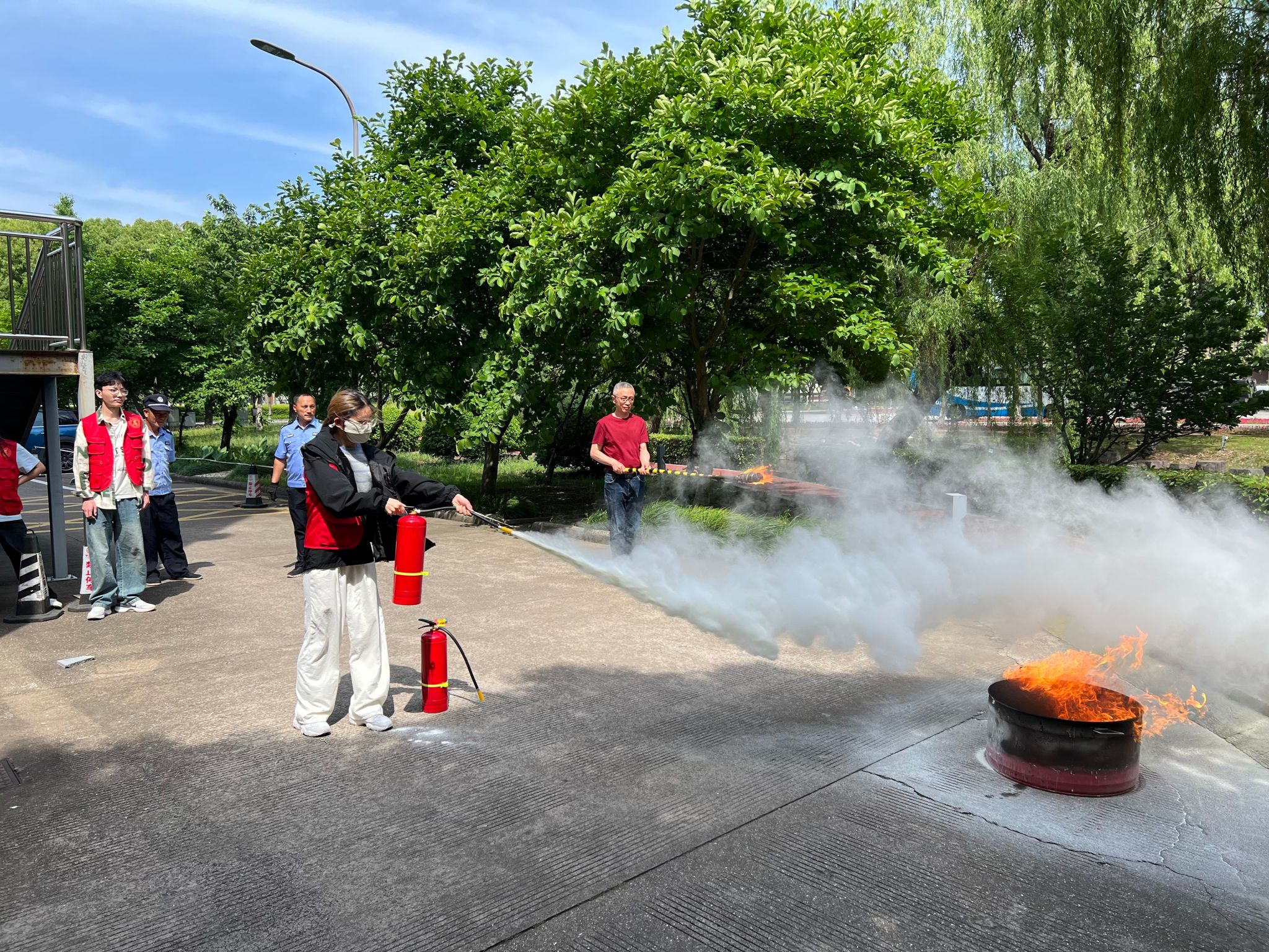 在演练现场,郑永辉老师拿起干粉灭火器讲解结构。他指着瓶身说这是储存灭火剂和气体的部分,又介绍压力表像“健康监测仪”,绿色正常、黄色偏高有隐患、红色失效。接着示范使用方法,概括为“提拔握压”;“提”是双手握提把,将灭火器提到距火源 5 米处;“拔”是捏住保险销拉环果断拔出;“握”是握紧喷管对准火焰根部;“压”是用力压下压把,左右摆动喷管让干粉覆盖火焰。在郑永辉老师为大家做完正确示范后,同学们踊跃参与到实践中,亲自上手使用灭火器,体验灭火过程。