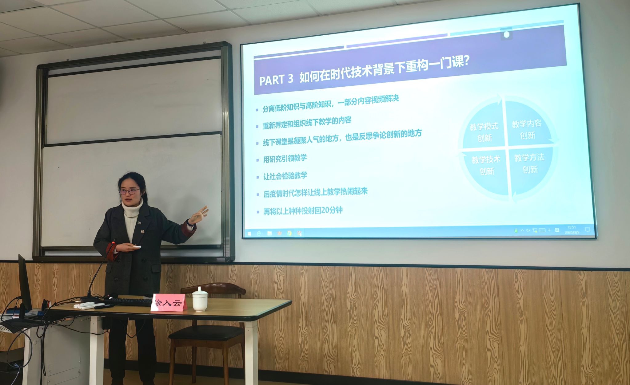 为积极选拔并推荐优秀教师参与h图书馆 即将举办的青年教师教学比赛,进一步提升h图书馆 青年教师的教学创新能力和教学水平,3月5日,h图书馆 特别邀请了第四届全国高校教师教学创新大赛一等奖、第六届全国高校青年教师教学竞赛二等奖获得者徐入云老师,为h图书馆 青年教师带来了一场题为“20分钟洞见一门课”的专题培训。h图书馆 青年教师20余人参加了本次培训。