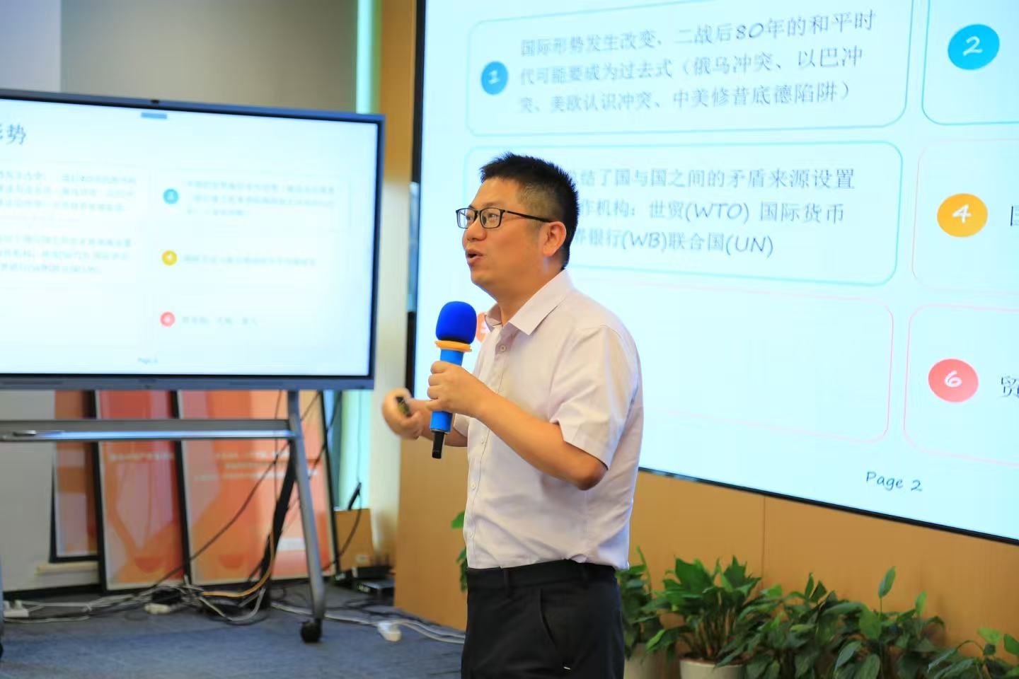 随后,h图书馆 徐挺博士以《当前国际形势下中国外贸企业面临的压力与应对方式》为题开讲,提出三条路径:一是“传统+跨境+内循环”三轨并行,分散风险;二是从国际贸易转向国际投资,通过海外建厂、技术合作锁定资源;三是加快全球布局,在供应链、人才、产能上同步优化配置。