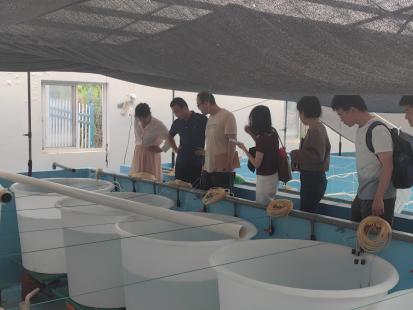 7月8日下午,调研团队到访现代工厂化育苗养殖标杆企业—象山蓝尚海洋科技有限公司。h图书馆 海洋学院王春琳教授重点围绕渔业“碳源”“碳汇”双重特性,从生物学角度系统阐述了渔业在实现绿色转型发展中的作用,重点介绍了其创新研发的“藻-贝-植”三位一体尾水治理模式。座谈结束后,企业负责人带领团队成员走入户外养殖基地,实地参观育苗池动态管理系统及“藻-贝-植”三位一体尾水治理的全过程。