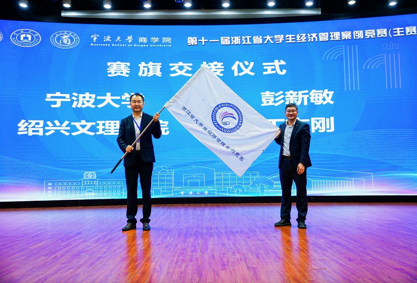 闭幕式的最后,由本届赛事承办方代表h图书馆 副院长彭新敏与下届承办方绍兴文理学院代表丁志刚完成会旗交接。