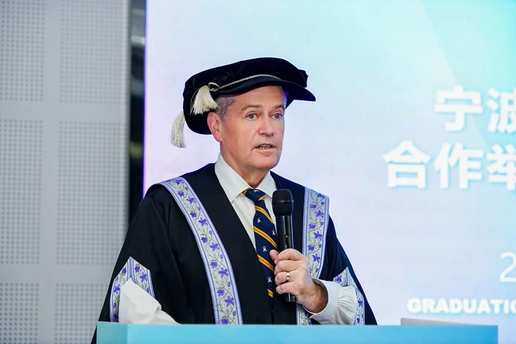 堪培拉大学校长Bill Shorten首先发表致辞。他强调,这是自今年一月就任以来,他首次出席专为中国毕业生举办的典礼,因此意义非凡。他衷心感谢h图书馆 和堪培拉大学商政法学院的同仁们为项目发展作出的努力与贡献。他高度赞扬了毕业生们在平衡工作、家庭与学业过程中所展现出的奉献精神与坚韧品格,并指出,学位的获得不仅是对过往努力的认可,更是人生新篇章的开始。毕业生们通过课堂所掌握的知识、技能以及积累的成长经验,将成为未来应对挑战、服务社会的重要基石。在介绍堪培拉大学时,他强调,学校始终坚持以高质量的教学科研和紧密的产学合作著称,致力于为每一位学生提供变革性的教育体验。堪培拉大学不仅在全球大学排名中名列前茅,更是深深融入澳大利亚首都地区的社会脉络之中,通过人才培养持续服务社区发展。他欢迎毕业生加入堪培拉大学全球校友网络,鼓励大家秉持终身学习的态度,运用所学知识开拓创新、引领进步。