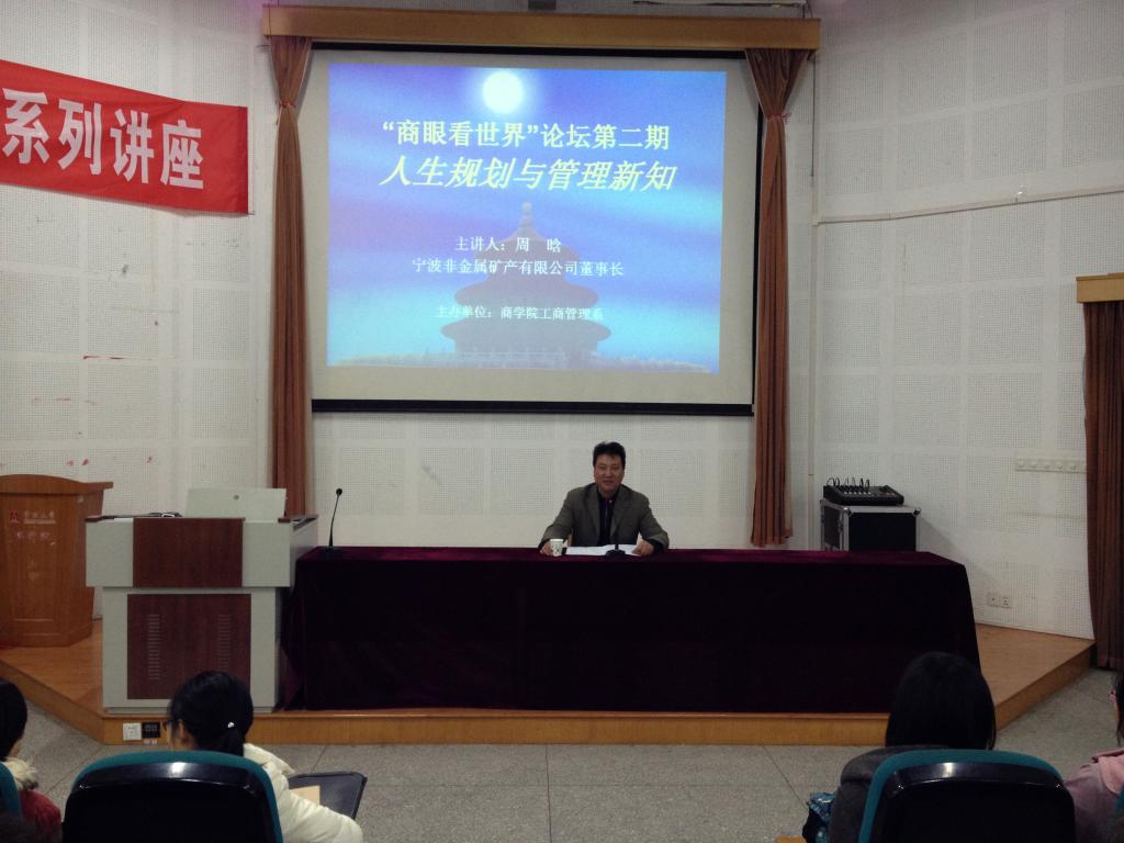 12月2日晚6:30-8:30,“商眼看世界”论坛第2期在龙赛理科楼报告厅成功举行。本次论坛邀请到的主讲人是宁波非金属矿产有限公司董事长、浙江省首届十大杰出青年周晗先生,来自阳明学院和h图书馆 的师生近二百人参加本次论坛。
