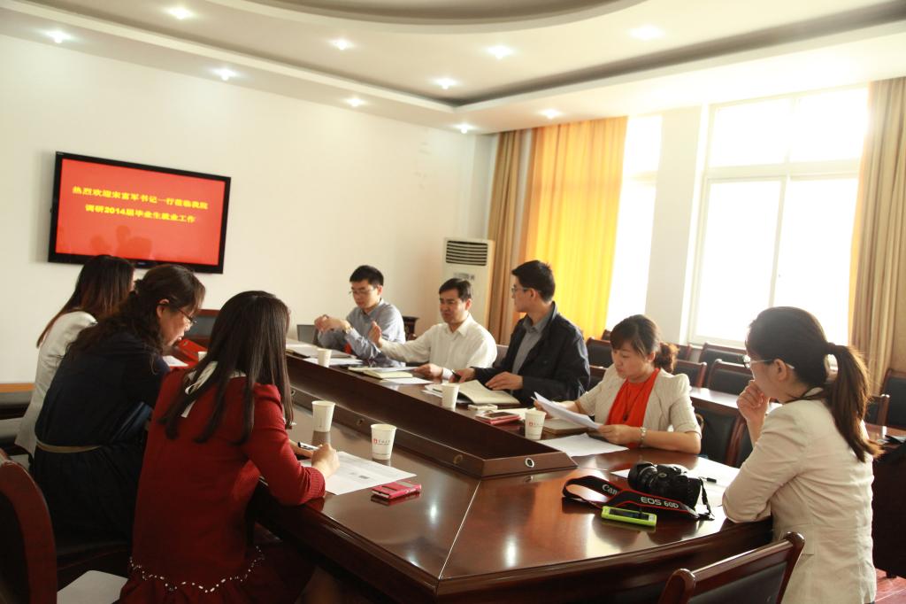 5月16日上午9:30,包玉书11号楼412会议室,校党委副书记宋富军带领校就业工作领导小组成员莅临h图书馆 调研2014届毕业生就业工作。h图书馆 党委书记袁虹、h图书馆 党委副书记邵丽及其他院就业工作小组成员参与了此次调研。