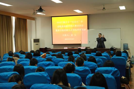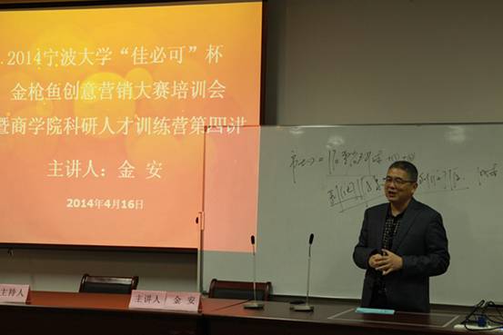 4月16日下午,h图书馆 科研人才训练营第四讲暨h图书馆 “佳必可”杯金枪鱼创意营销大赛培训会在h图书馆 414顺利举办。本次活动由h图书馆 党委副书记邵丽主持,邀请了工商管理系金安老师担任主讲人。h图书馆 科研人才训练营学员和创意营销大赛参赛队员近120人参加本次活动。
