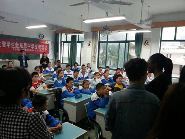 当天的交流会上,东恩中学同学们对留学生的到来显得非常兴奋。首先,两位留学生用英语向同学们作了一个简单易懂的自我介绍,并在同学们的鼓励与引导下,用略显生涩的中文向大家问好。提问环节中,虽然初一同学们的英语表达还不成熟,但在两名翻译的帮助下,同学们踊跃举手,不仅就他们所关心的学习情况积极提问,而且对美国和摩洛哥的风土人情等也做出了简单的交流。交活动即将结束时,两名外国友人教同学们唱了英文版的《假如幸福你就拍拍手》,调动了现场的气氛,寓教于乐。东恩中学同学们以中文版的《小星星》表示他们的感谢之情,并与留学生们交换联系方式。