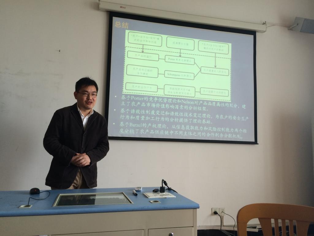 为及时总结和分享学术论文撰写与项目申报经验,适时动员和推进浙江省自然科学基金等项目的申报工作,2015年5月6日上午,主题为“农产品供应链研究:合作绩效与剩余分配”的学术沙龙和课题申报经验交流会,在h图书馆 523会议室如期举行。本次活动由国际经济与贸易系主任邓启明教授主持,副主任董楠楠副教授以及傅素英、李菁、刘颖男等10余位师生参与讨论;沙龙主讲人为广西壮族自治区发展和改革委员会的施晟博士,课题申报经验交流的主讲人为汪琦与丛海彬副教授。