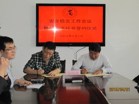 会上,首先由邵丽老师总结以往h图书馆 在安全稳定工作中存在的不足与取得的成绩,并分享了前一天去学校保卫处学习取经的内容,随后由院长范柏乃代表学院与各系、所、办签订2015年h图书馆 安全稳定综治工作目标管理责任书,最后院党委书记熊德平谈在安全方面h图书馆 还需要做的工作,熊书记讲到对于我们文科性学院,需要加强在科研项目等方面的知识性安全意识,同时从大到国家利益,小到师生人身财产安全切实希望大家重视安全问题并要求把会议精神传达给所在部门的每位师生,防患于未然。