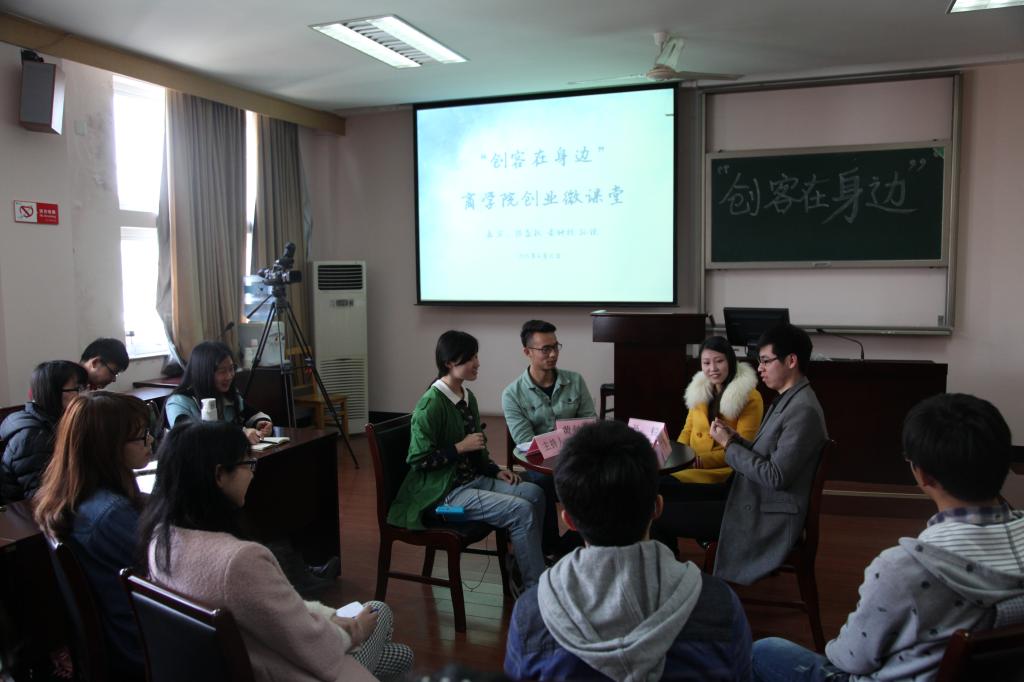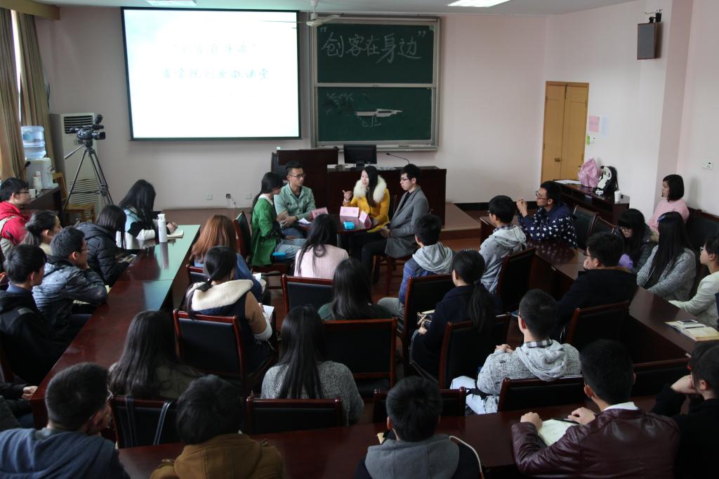 4月10日下午,“创客在身边”h图书馆 首期创业微课堂暨创新创业人才训练营第二讲在h图书馆 418正式开讲。“宁大乐生活”微信公众号创办人、东街里创业街“新出炉“披萨店店主黄钟杭,宁波市镇海泰皓机械有限公司、宁波市镇海九象机械有限公司创办人孙锐,宁波时荣文化传媒有限公司合伙人、宁波宾格企业管理咨询有限公司法人陈益权,三位学生身边的创业达人做客本期微课堂,与40余名怀揣创业梦想的商院学子共谈创业梦。