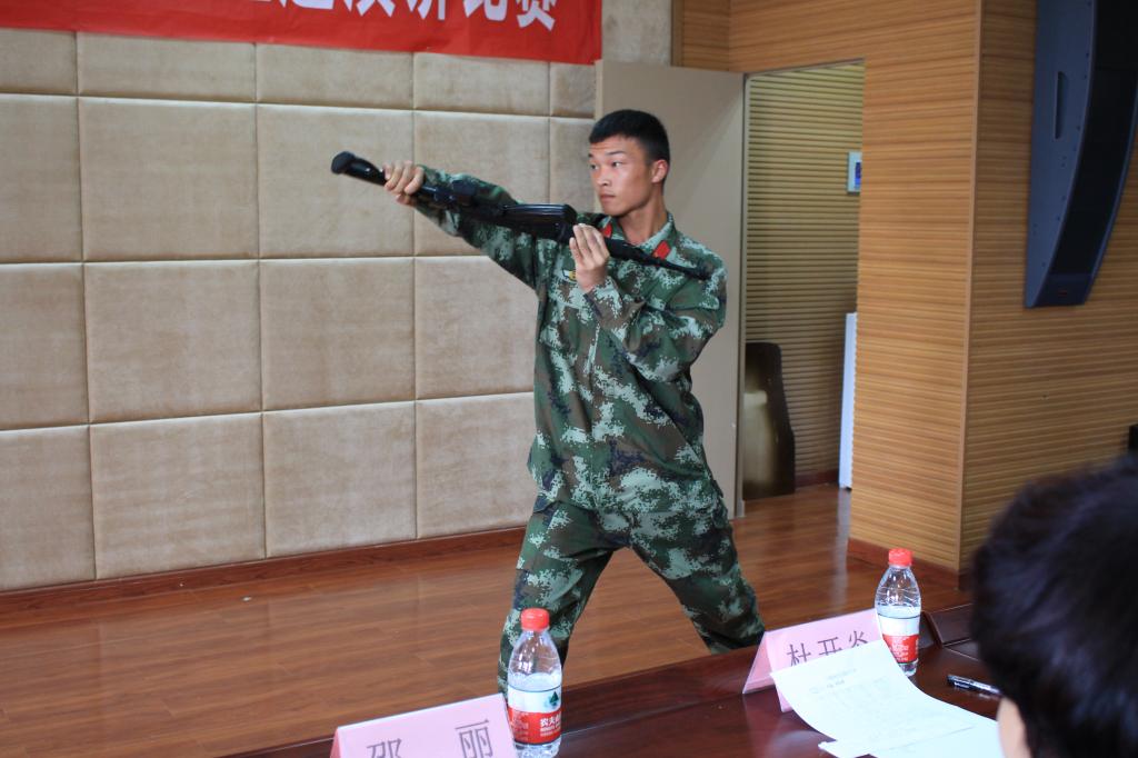演讲比赛在“红星闪闪”的合唱声中拉开序幕,来自一连十三个排的十三名决赛选手逐一登台,有的选手以清唱军营歌曲作为自己演讲比赛的开场,有的同学选用雄壮的背景音乐衬托自己的演讲内容,有的则以诗歌的形式旁征博引,他们时而深情委婉,时而慷慨激昂,比赛全程精彩纷呈。演讲技巧的巧妙运用让全场不断惊叹此次比赛的水准和选手的实力,更让全场感动的是每一位选手用自己最真实的经历和情感,讲述了自己在军训中的蜕变,在汗水中学会严谨和坚持,在教官的耳濡目染中学会青年学生该有的担当和责任。演讲比赛结束之后,院党委书记熊德平作了总结讲话,他高度赞扬了比赛选手的优秀表现,同时希望同学们勿忘历史,心系国防,要牢固树立对革命军人的崇敬之情,珍惜军训时光,不断地提高和充实自己,同时勉励同学们坚持将军训中学习到的优秀品质贯穿于日后的学习生活中去。