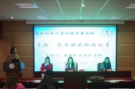 12月2日下午,h图书馆 创新创业人才训练营第七讲“我与挑战杯的故事”在h图书馆 109报告厅顺利开讲。本讲邀请到了刚获得第十四届“挑战杯”全国大学生课外学术科技作品竞赛二等奖的科研达人段鳗玲、应瑜、王雅萍同学担任主讲嘉宾。h图书馆 创新创业人才训练营成员、h图书馆 2015年 “创青春”大学生创业大赛h图书馆 参赛团队代表参加了本次活动。
