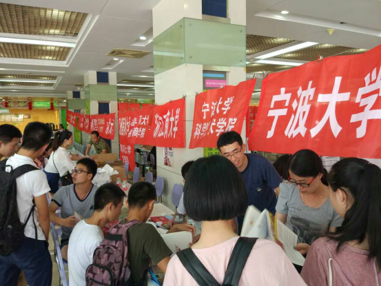 宣传人员冒着炎热的天气,为前来咨询的考生和家长答疑解惑。在浙师大站,h图书馆