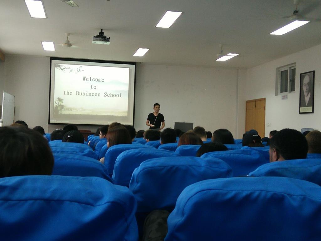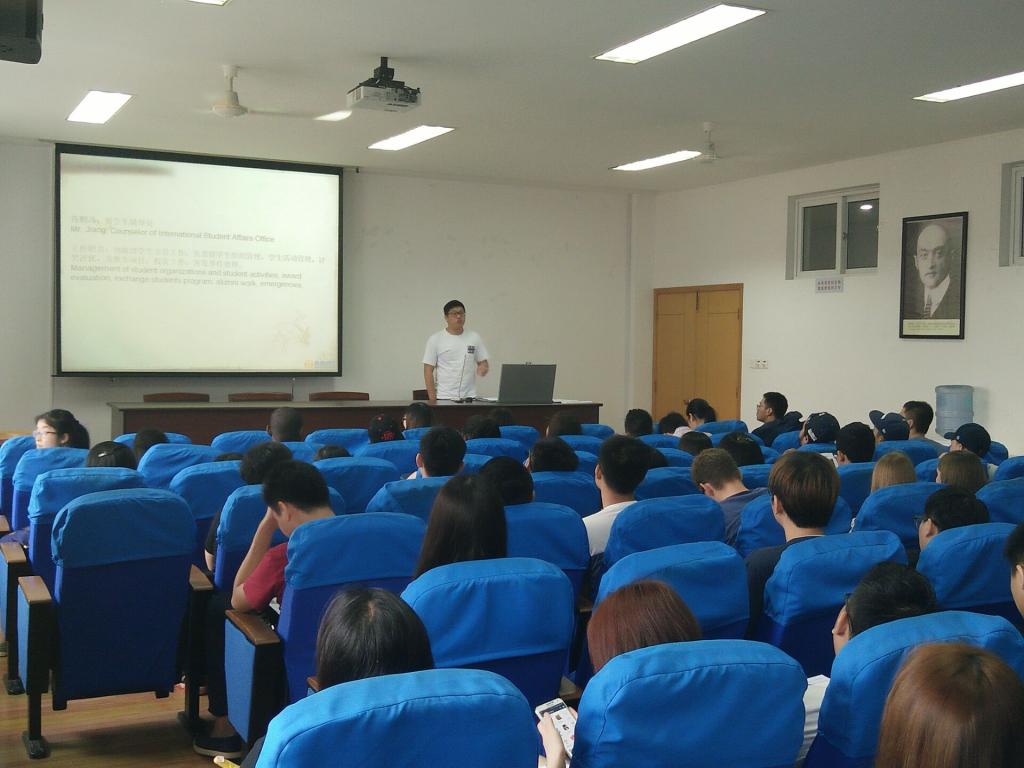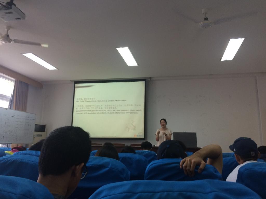 上午10点,新生们陆续到达了h图书馆 414教室。首先,毛老师向大家介绍了留学生办公室成员,并陈述了成员的职责和联系方式。接着,各班班主任进行了自我介绍并宣布了班会时间及地点。随后,王小西老师向新生们介绍了相关课程安排并且为新生们答疑解难。最后,老生代表Munawar发表了的精彩的演讲,向新生们深情并茂的讲述自己在中国的留学经验并给予新生一些学习和生活上的建议。会议结束之后,留学生组老师以及老生代表带领了新生进行了游园活动。