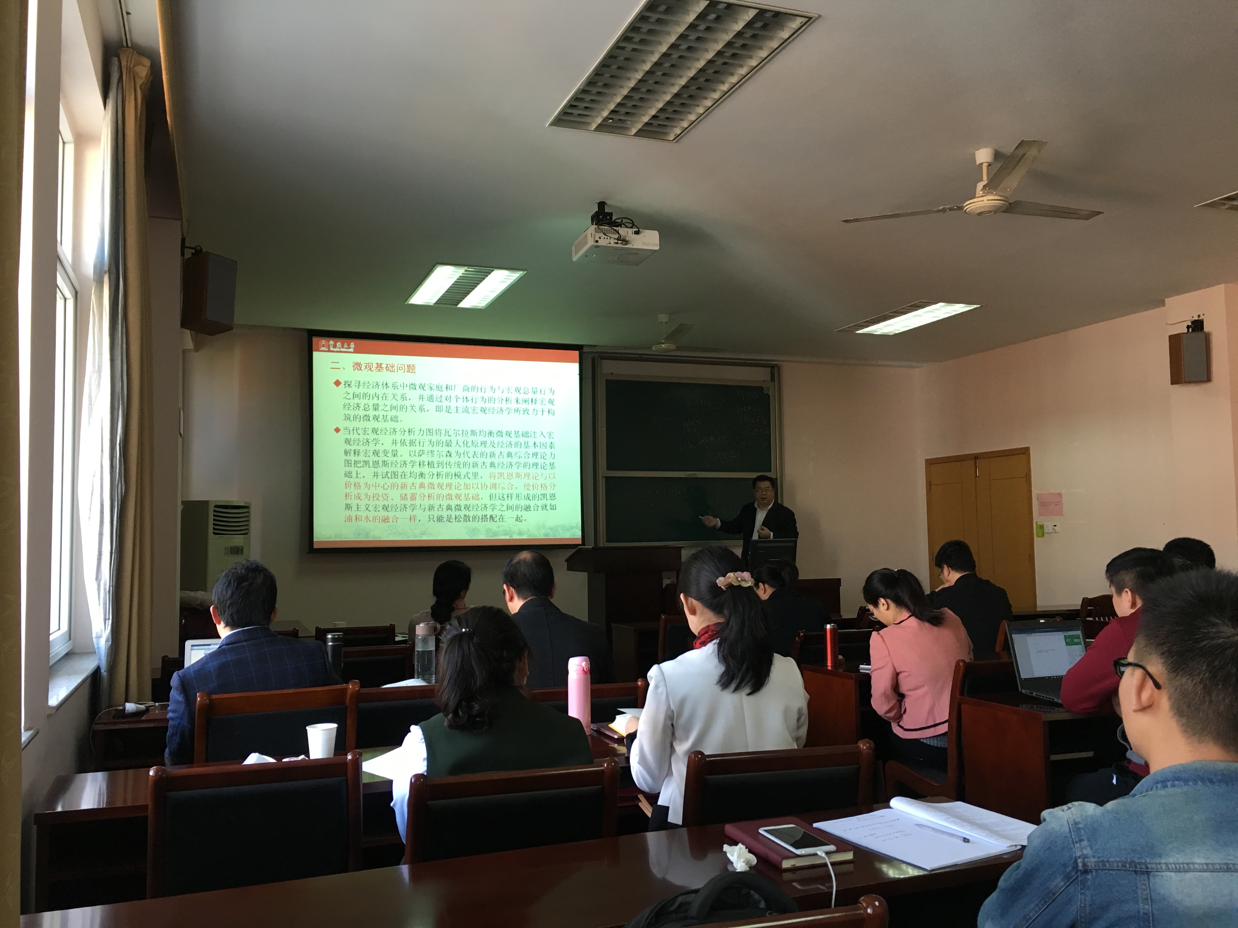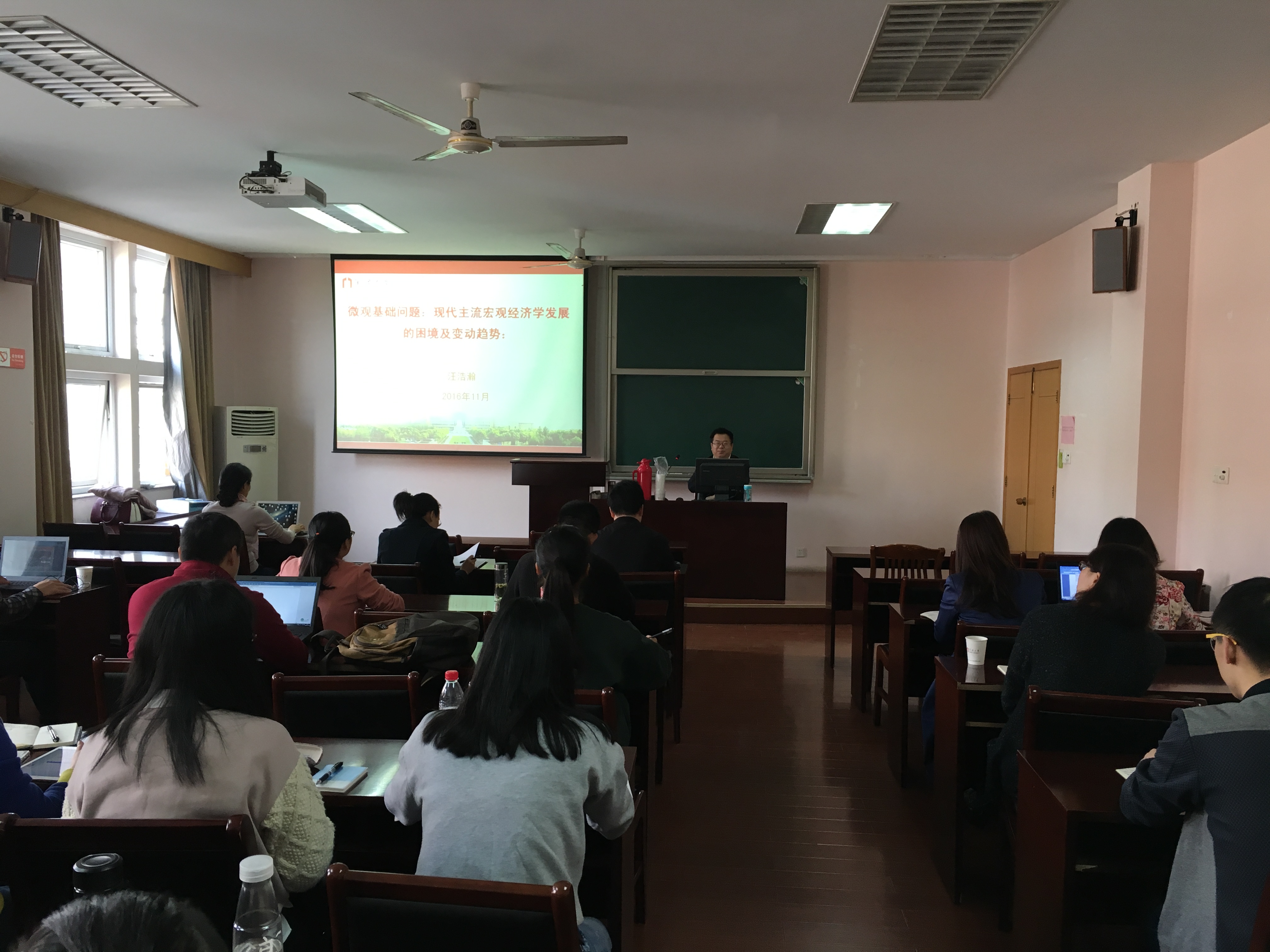 2016年11月16日上午,h图书馆 学术沙龙(2016年第11期)在11#418会议室举行。h图书馆 党委委员、产业经济研究所教授、博士生导师汪浩瀚做了题为《微观基础问题:现代主流宏观经济学发展的困境及变化趋势》的精彩学术报告。学术沙龙由产业经济研究所所长胡求光教授主持,h图书馆 院长助理陈涛教授以及h图书馆 师生50余人参加了此次学术活动。