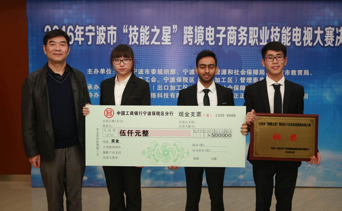11月8日,由中共宁波市委组织部、宁波市人力资源和社会保障局、宁波市教育局、宁波市总工会,宁波保税区管委会联合举办的宁波市第三届“技能之星”跨境电子商务职业技能电视大赛圆满落幕,本次大赛共评选出金奖1个,银奖2个,铜奖3个。h图书馆 中外学子组成的“孟想-(M-ideal)”参赛团队经过激烈角逐获得了大赛铜奖,队员分别是来自15级国际经济与贸易全英文专业的曹成栋、戴欣媛,16级工商管理(全英文)专业的成昱黄和13级国际经济与贸易专业的孟加拉国留学生Shadman。