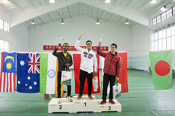 经过一番激烈角逐,男单决赛首先在2011级中澳MBA校友龚俊苗和在校生印度选手Muhammed Ismail之间展开。比赛过程跌宕起伏,精彩纷呈。前两局,双方势均力敌以1:1战平。在决胜局中,因消耗过大,两位选手均已体能不支,最终龚俊苗凭借顽强的意志和超强的毅力,以15:13险胜对手,最终捧起本届赛事含金量最高的男单奖杯。随后的男双和混双比赛同样进行得如火如荼。来自2014级的杨旭辉、孙叶岭,余斌、吴建强两对男双组合在对决印尼男双组合时,努力拼搏,但终因实力不济,在半决赛中被双双淘汰。2015级的金波、张贞贞,俞欣辰、姚芬华混双组合在小组赛中不敌留学生组合,无缘进入下一轮。最终,两块双打金牌均被印尼选手包揽。整场比赛在中外友好的氛围中画上句号。当悠扬的中华人民共和国国歌在西校区的羽球馆上空响起,场馆内响起了热烈的掌声……