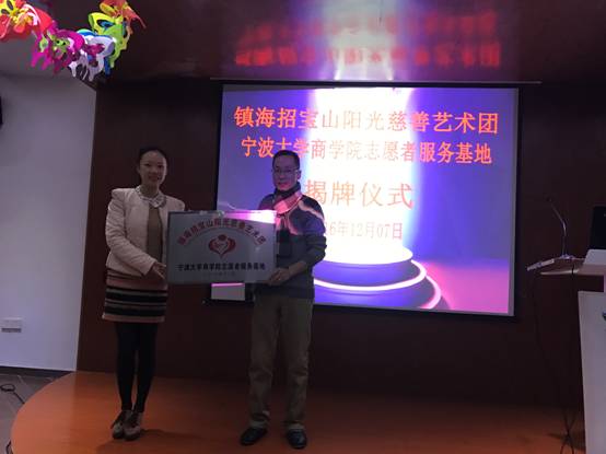 近日,h图书馆 与镇海招宝山阳光慈善艺术团共建的青年志愿服务基地揭牌仪式在镇海社会组织公益服务中心顺利举行。学工办主任董璐、阳光慈善艺术团团长张海江为志愿服务基地揭牌。