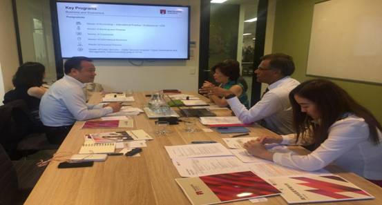 12月14日全天,代表团一行回访了Macquarie University(麦考瑞大学),在麦考瑞大学访问期间,陈老师和澳大利亚麦考瑞大学h图书馆 副院长Philomena Leung教授,会计系主任Rahat Munir教授、国际事务大中华区主管Stephen Fan先生、国际部项目经理Cherilyn Liu女士进行了亲切友好的洽谈,Philomena Leung教授首先介绍了该学院的历史、专业设置、课程设置、培养目标等方面,随后Rahat Munir教授重点介绍了麦考瑞大学会计与金融专业的情况。陈老师简要介绍了h图书馆 的办学历史与发展现状,并就此次访问的目的进行了重点介绍:希望在双方已有的“3+2”本硕直通车合作意向基础上,尽快将意向进一步细化落实,争取早日起动两院合作项目,同时还希望两校的合作能拓展到信息系统与信息管理、经济学、国际贸易等专业的本科“2+2”合作项目上。