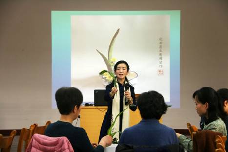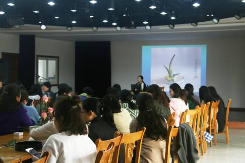 李菁老师的讲座分为两个部分:花道理论知识和实践。理论部分讲述了花道的起源,流派和类型;实践部分重点讲述了花道的基本技巧:包括确定主枝与花器的长度、位置比例关系,确定客枝与主枝的比例与位置关系,确定中间枝与客枝的长度位置关系以及填充辅助花材。