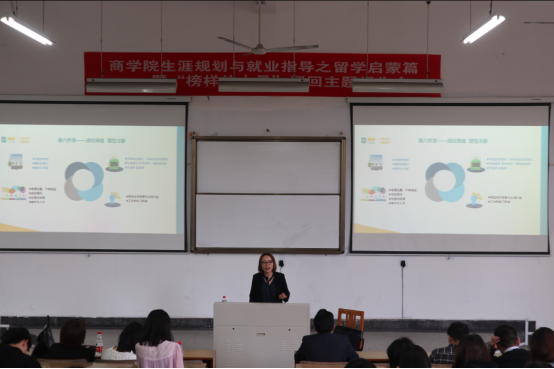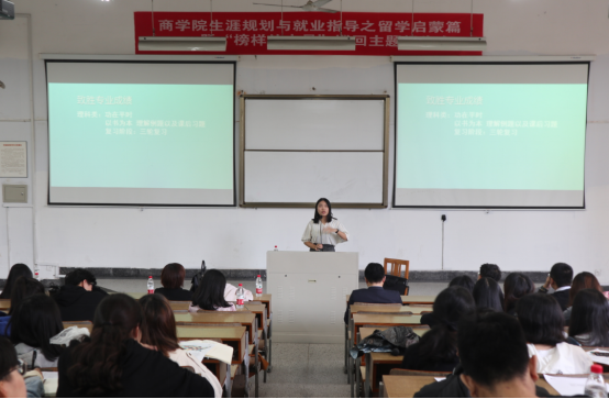 今日,h图书馆 生涯规划与就业指导留学启蒙之“榜样的力量”活动,在h图书馆 包氏教学楼四号阶梯教室成功举办,共计180余位商院各年级学生参加了本次活动。此次活动邀请了15级优秀学生代表吴金红同学、知名留学导师徐娇老师和赴美实习实践项目指导霍老师三位嘉宾,他们分别从学生、海外大学和海外企业三个维度出发,为同学们系统科学地介绍了留学相关知识。