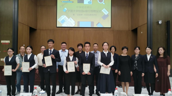 在活动中,第二届和第三届h图书馆 校园E银行代表李官正和廖亚男分别进行了工作总结及对未来的展望,表达了对接下来工作的决心和信心;中国建设银行宁波市分行副行长韩国辉为第三届校园E银行学生团队颁发聘书并合影留念。