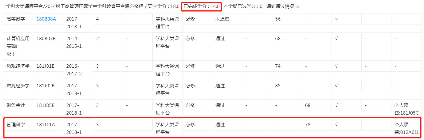 例如,该生因培养方案变更,用2学分的管理科学顶替了3学分的同名课程。该课组的已完成学分是按应修课程的3学分计算的,小计为14分,而其实计算总学分时是按实际修读的012A61L的学分2学分加总的。因此,模块完成情况为“√”后,还要仔细核查总学分的完成情况。