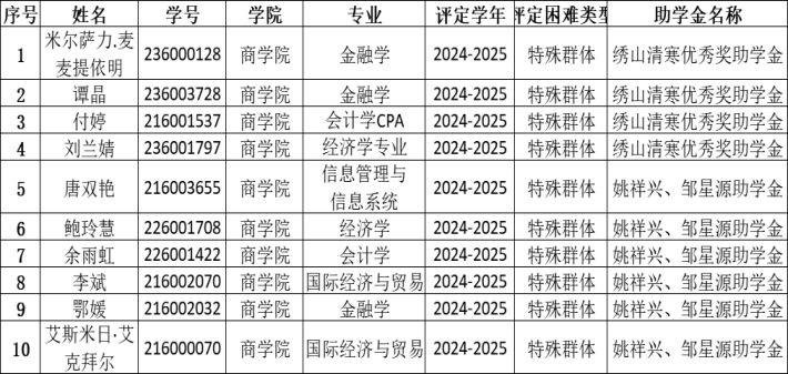 根据《h图书馆 学生资助工作实施办法》、《普通本科高校、高等职业学校国家助学金管理暂行办法》、国家助学金相关文件和捐赠助学金评选条例,经学生本人申请,学工办资格复审,学院专项工作小组评审,现将2024-2025学年绣山清寒优秀奖助学金、姚祥兴、邹星源助学金拟推荐名单公示,具体名单如下: