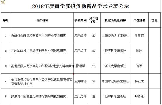 根据商院政[2016]26号文件精神,由教师本人申请,经各研究所推荐,学院组织专家评审。2018年度学院拟资助精品学术专著5部,现予以公示(详见清单)。