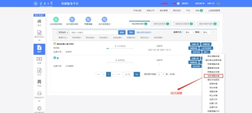 4. 进入项目组成员,请确认成员是否完整。特别是项目中有学生的参与的,请完善学生身份类别。成员信息有问题的,进入科研系统h图书馆,左侧的项目界面,点击操作下拉框下的成员调整申请,进入成员调整界面进行添加和修改,待项目主管审核之后,会自动补充到项目经费公开一览表,最后再提交即可。