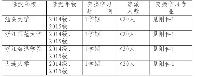 为了提高本科人才培养质量,加强与国内高校“资源共享、优势互补”,以拓展学生专业视野、感受异地校园学术及文化氛围、享受优质教学资源、提高综合素质与能力,我校将从2014级、2015级本科生中选拔优秀学生于2016-2017学年春季学期赴浙江师范大学、浙江海洋学院、大连大学交换学习,为期1学期。为做好选派工作,现将有关事宜通知如下: