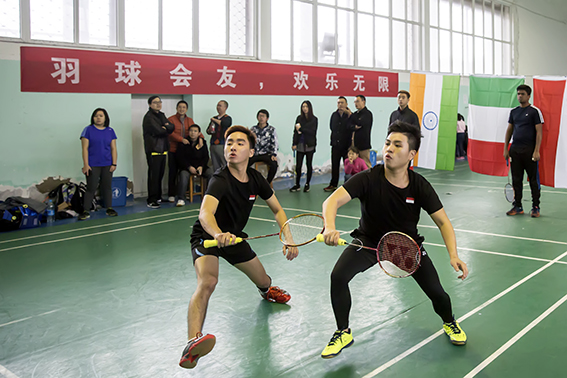 经过一番激烈角逐,男单决赛首先在2011级中澳MBA校友龚俊苗和在校生印度选手Muhammed Ismail之间展开。比赛过程跌宕起伏,精彩纷呈。前两局,双方势均力敌以1:1战平。在决胜局中,因消耗过大,两位选手均已体能不支,最终龚俊苗凭借顽强的意志和超强的毅力,以15:13险胜对手,最终捧起本届赛事含金量最高的男单奖杯。随后的男双和混双比赛同样进行得如火如荼。来自2014级的杨旭辉、孙叶岭,余斌、吴建强两对男双组合在对决印尼男双组合时,努力拼搏,但终因实力不济,在半决赛中被双双淘汰。2015级的金波、张贞贞,俞欣辰、姚芬华混双组合在小组赛中不敌留学生组合,无缘进入下一轮。最终,两块双打金牌均被印尼选手包揽。整场比赛在中外友好的氛围中画上句号。当悠扬的中华人民共和国国歌在西校区的羽球馆上空响起,场馆内响起了热烈的掌声……