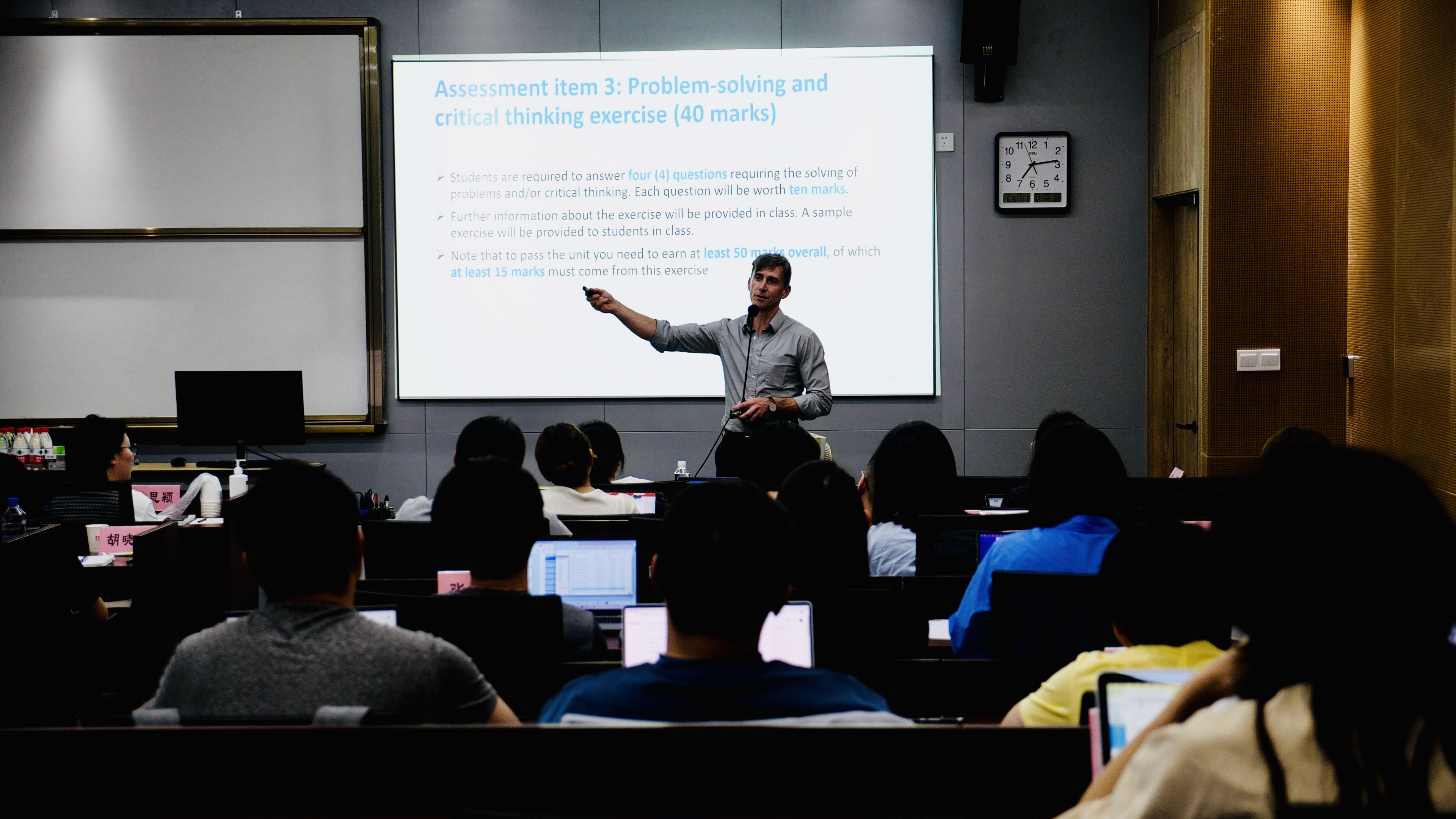 Freyens 教授课上对《国际商务》课程进行了简单的介绍。该课程致力于将理论知识与实战经验、管理经验相结合,助力渴望突破国际市场的企业管理者深入了解全球商业环境,提升战略思维,增强在国际商业实践中学以致用的能力。课程安排在工作日晚上,一天工作的疲惫与夏日的炎热并未影响到同学们上课的热情,聚精会神听讲,认真参与老师的提问与讨论,整个课堂积极融洽。