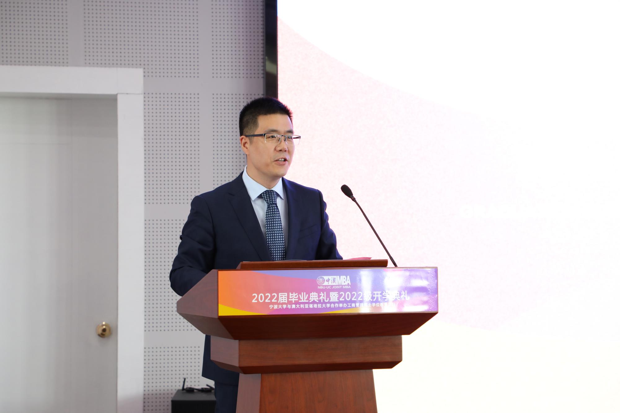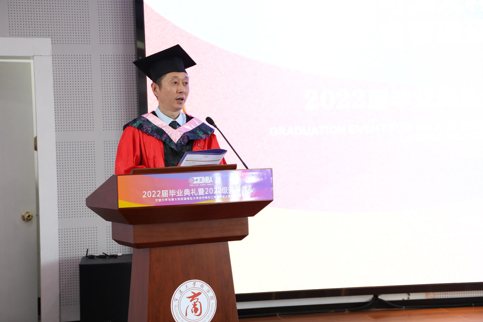 在澳大利亚堪培拉大学的毕业典礼现场视频播放后,金院长首先致辞。他祝贺同学们顺利完成学业,感谢老师们的辛勤付出,也感谢社会各界对h图书馆 中澳MBA发展的支持。他指出中澳MBA项目应该及时顺应社会发展变化趋势,定位高质量发展培养体系,培养更多“有创新思维,懂资本运营”的人才;同时,他还提出“大学MBA”教育应通过学生自主“批判式”学习,敢于挑战教科书中的权威理论观点,增加同任课教师的课堂互动,“敢问问题”、“会问问题”,来有效提升课堂的教学质量,增加学习的探索性和研究性;第三点,他提出项目要进一步提高游学活动质量。“读万卷书,行万里路”。培养学者和有思想的人,“行万里路”是非常重要的。金院长通过分享他暑期的游学经历,倡导MBA学员们要不断丰富自身的思想体系,训练悟性,激发灵感,为明天步向成功做好准备。