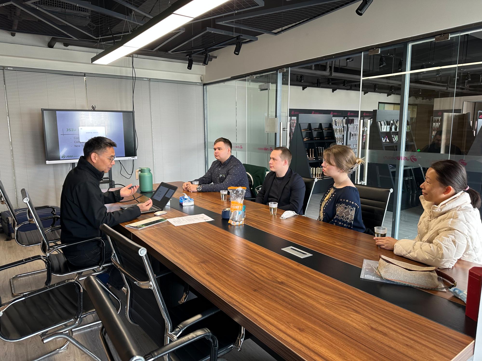 孙总首先向来访人员做了公司情况介绍。随后,孙总与俄罗斯同学就提供实习岗位一事进行了详细而深入的交流。双方经过探讨、考量和双向选择,最终有一名俄罗斯学生成功赢得了在宁波泰友进出口有限公司的实习岗位,并准备从下周一起正式开始为期两个月的实习工作。